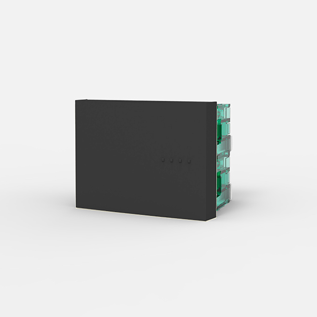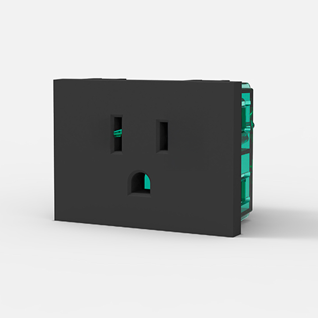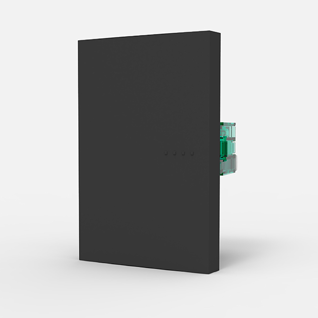 Llave de luz de diseño con formas básicas en su funcionalidad sin que esto impida que se destaque el equilibrio de lo artístico con lo moderno. Se destaca por generar una distancia entre la pared y la tapa que hace que esta se perciba como si flotara, conocido como Visual float. Los materiales puros pueden sufrir diferencias tanto de tonalidad o de textura entre lotes distintos de fabricación, por tratarse de materiales naturales.